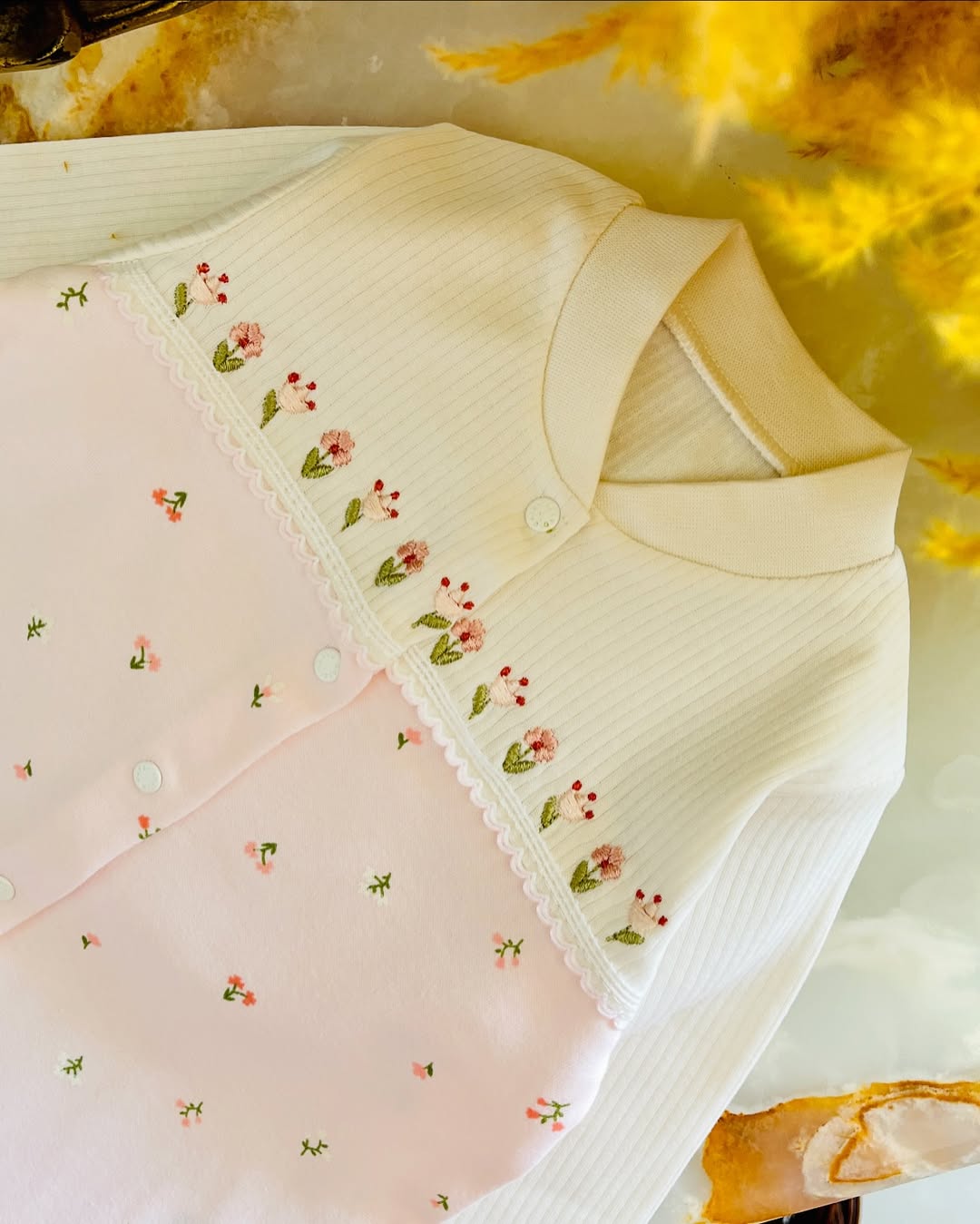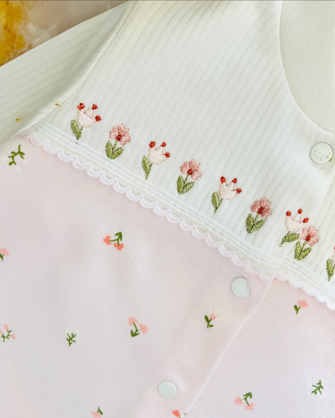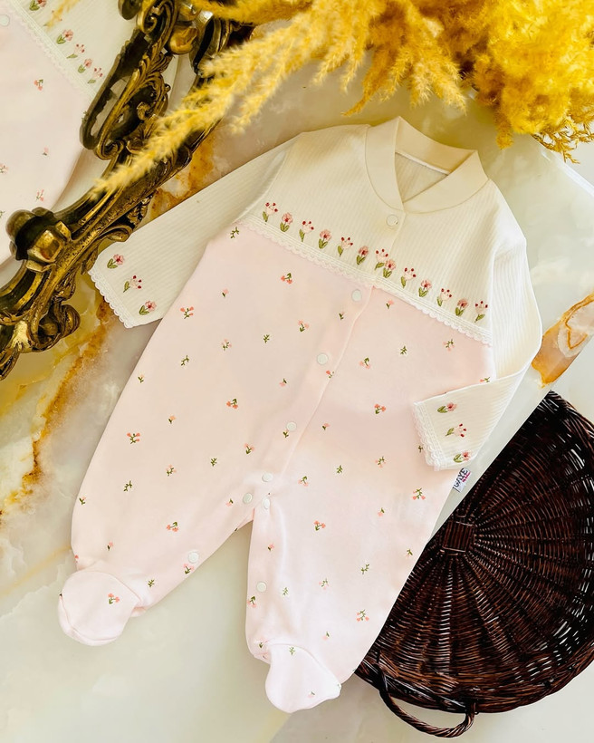 سرهمی نوزادی دخترانه ترک همراه شکوفه های نازش روی سینه و آستین ها گلدوزی های دلبری کار شده. کیفیت اینکار هزااار مثل برگگل نرم و لطیف. نخ پنبه درجه یک و چهار فصل ضد حساسیت.